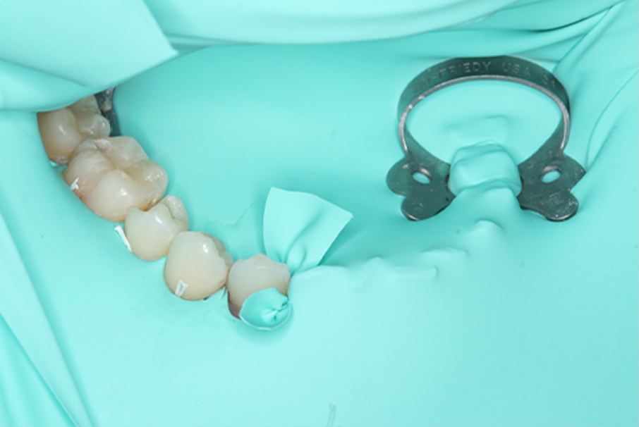 ラバーダムを装着し、歯の根っこの治療を行っていました。